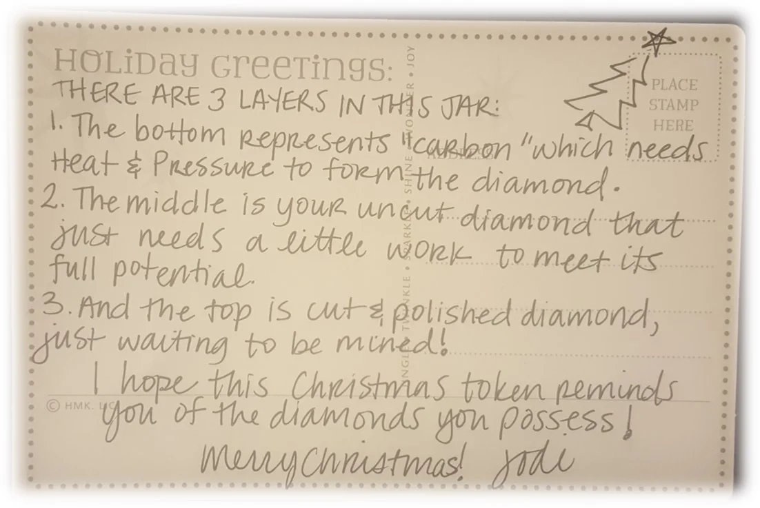 It was a small glass jar filled with three layers: Black powder on the bottom, some rough unpolished clear crystals in the center, and diamond-like crystals of varying sizes on the top layer. All tied with a pretty red ribbon (see the photo on the right).