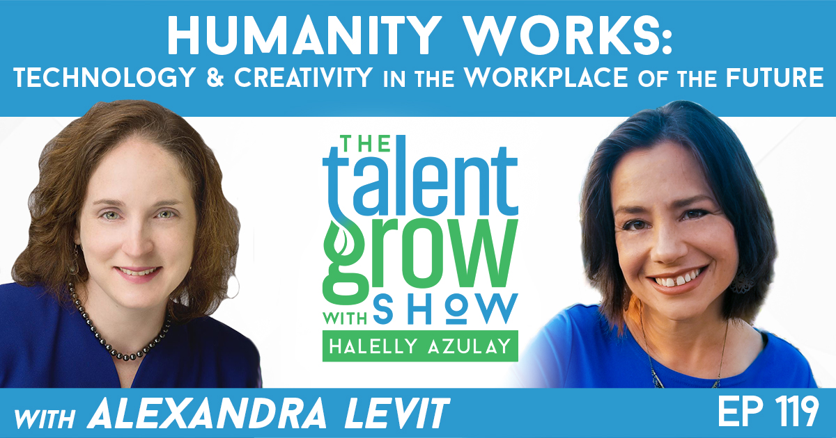 Halelly: TalentGrowers, we are having a slew of boomerangers lately, and that’s because so many of my guests are constantly evolving and creating more goodness in the world. Putting out new books, creating new interesting insights and I want to share that with you, so when it’s relevant, I do bring them back. Today we have Alexandra Levit coming back to the show to talk about the future of work, how you can prepare for it as an organization and as an employee. How to be aware of the kinds of things that are going to change and instead of just either being blind about them or freaking out about them, you can take proactive action to get yourself ready – you and your organization. We talk about the kinds of trends that she’s seeing as a futurist and that she has written about in her latest book Humanity Works. She talks about what are some of the biggest changes, what is the human edge, what kinds of skills you should be on the lookout for building and some examples. So I hope that you listen, that you take heart and that you take action. I’m Halelly Azulay, your leadership development strategist at TalentGrow and this is the TalentGrow Show. Here we go!
