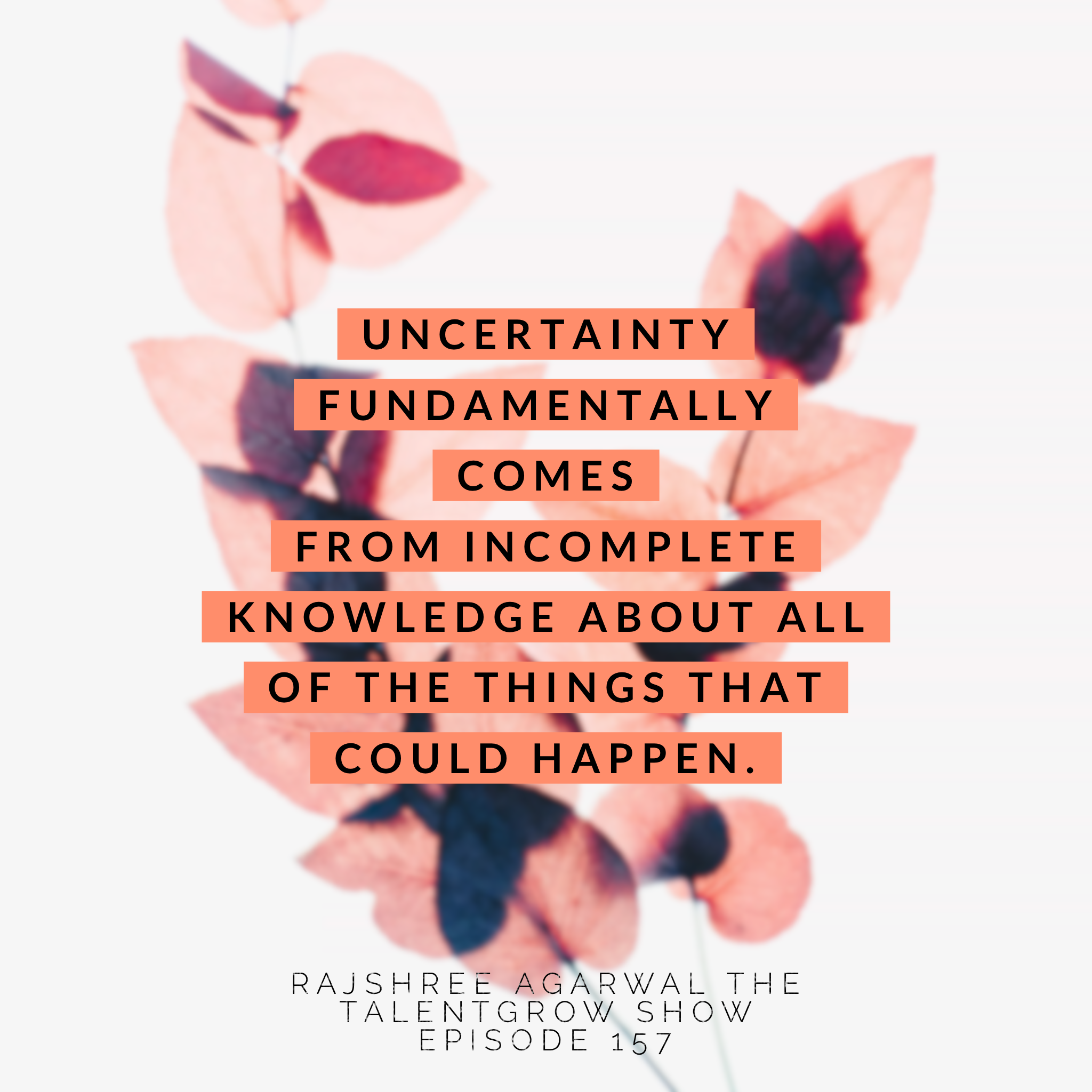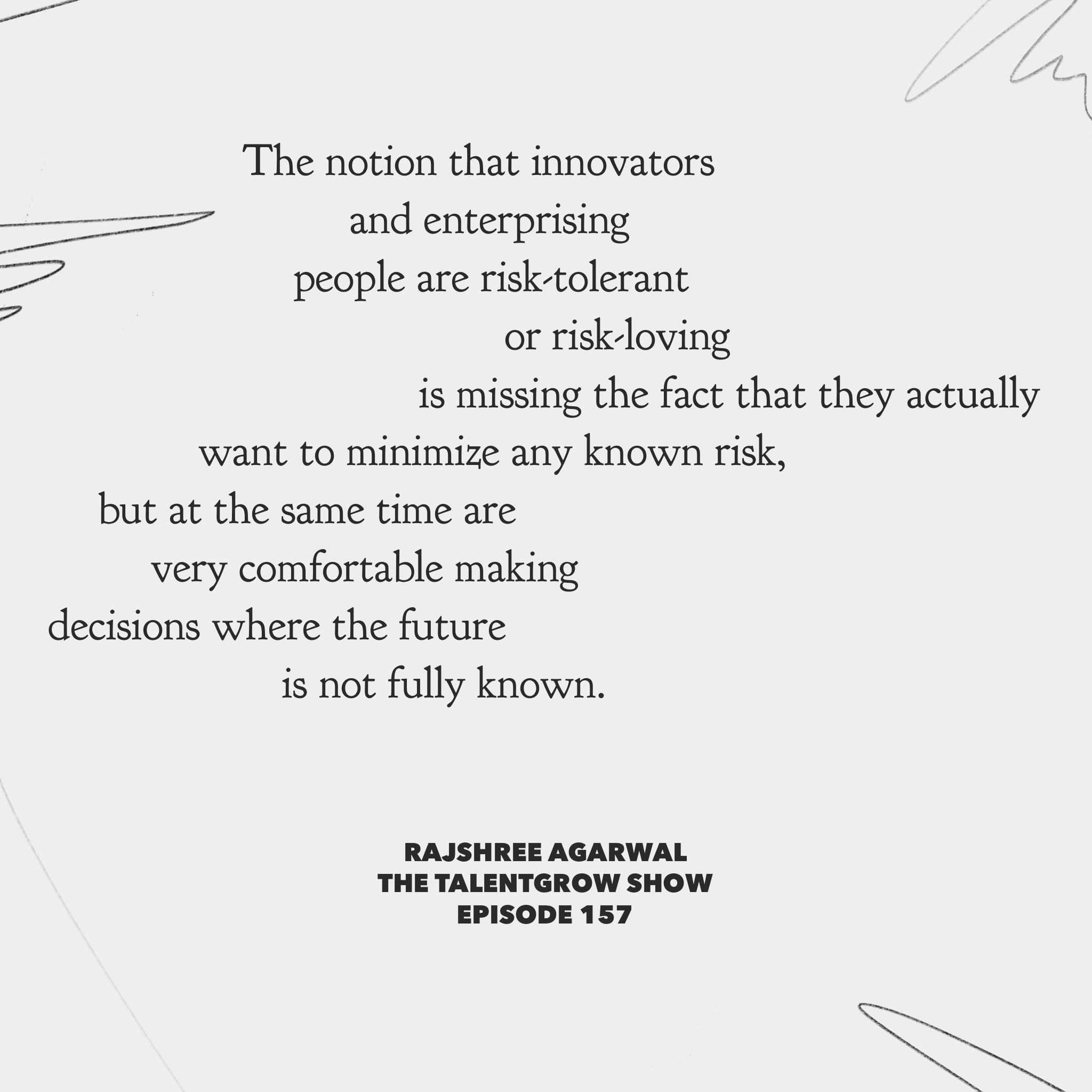 TEASER CLIP: Rajshree: Uncertainty fundamentally comes from incomplete knowledge about all of the things that can happen. But let’s face it – life itself is uncertain. And I think that the notion that innovators and enterprising people are actually risk-tolerant/risk-loving is missing the fact that they actually want to minimize any known risk but at the same time are very comfortable making decisions where the future is not fully known and determined.