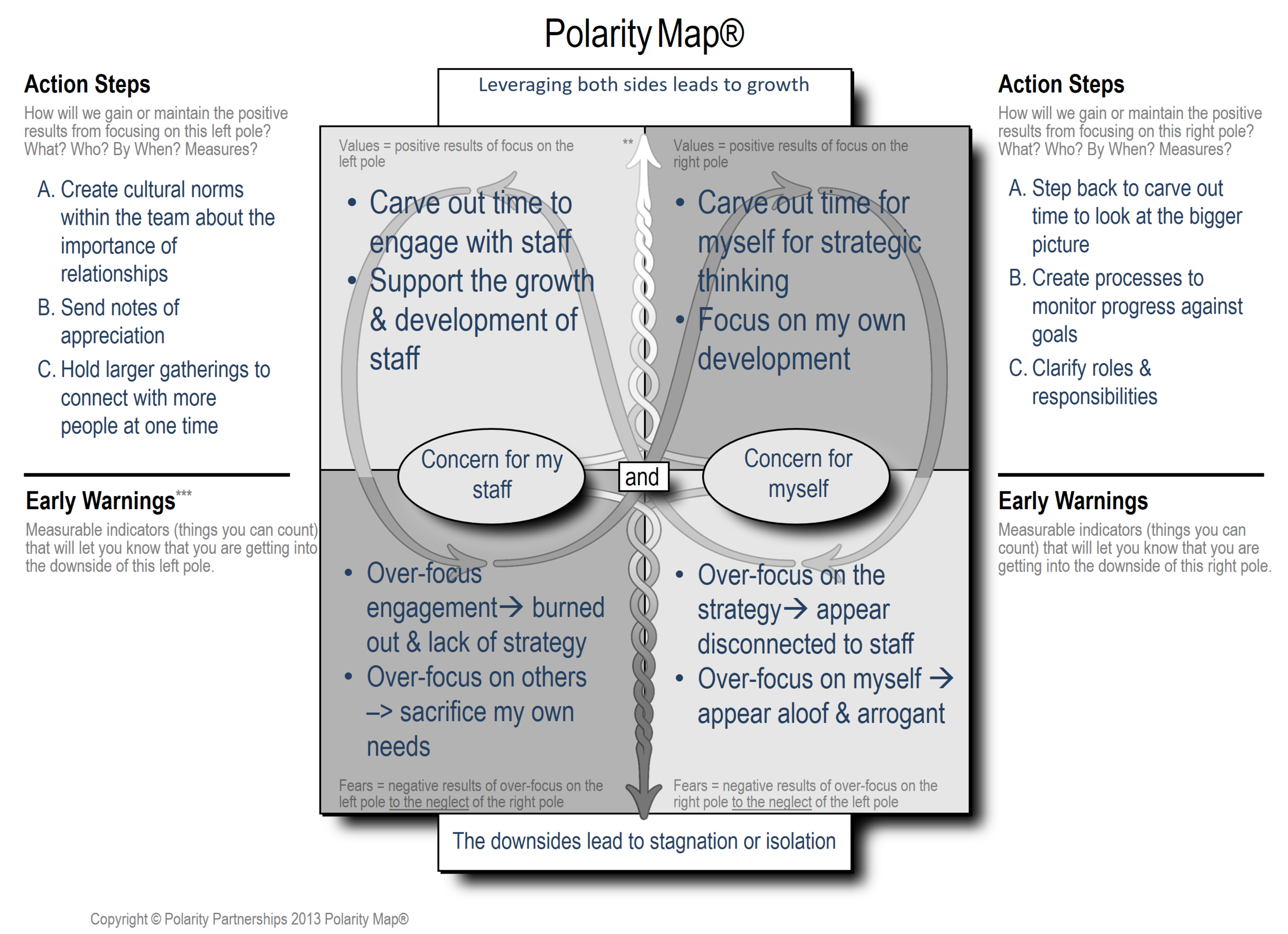 Laura: Yeah, it is. It is intense. And there is a lot to it. There is a lot of depth to it. On the surface level it seems, “Oh, okay, you want me to do both. I should consider both sides of a situation or I should behave in a way that I’m tapping into two areas of strength.” It seems simple, but what the polarity map does is it allows you, and the way I use it personally, is it allows you to have a picture in your mind to know at any given point in time, “Am I on the upside of one side or the other? Am I really leveraging both? Or have I gone to the downside of one or the other? Where am I?” And then this pathway that I call the path to recovery. What I find so powerful about this is often, when we do make mistakes or when we get stuck, we sort of stay there. And we are very self-critical, judgmental, and we just can’t get out of it. We’re stuck. It feels like damned if I do, damned if I don’t and you don’t know how to get out of it. By mapping it out, there’s actually a place for action steps and these things we call early warning signs.